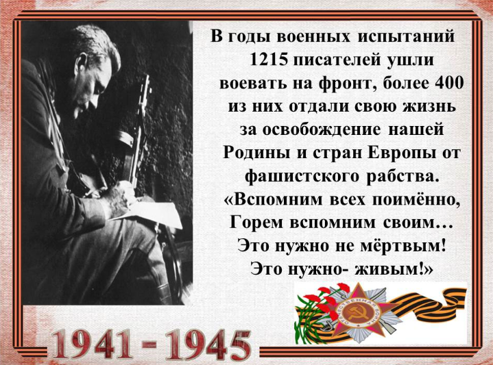 Литература, которая всегда была близка к народу, в годы войны буквально переплелась с жизнями людей. Писатели и поэты описывали подвиги советского солдата, воспевали свою Родину, вселяли в людей веру в Победу. Не было никаких сомнений в том, что наша Земля будет освобождена от фашистских захватчиков. Пусть нелегкой ценой, но она вполне оправдана.