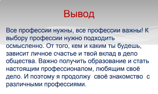 - В конце ученик делает вывод, к которому он пришел в результате работы над проектом.