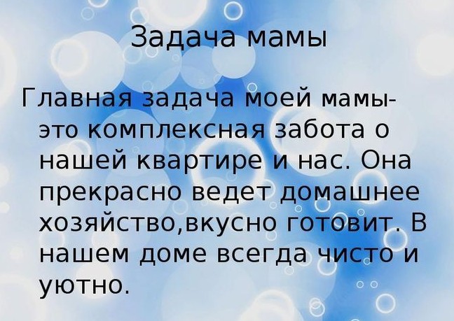 - Затем, о профессии матери: моя мама по профессии экономист менеджер.