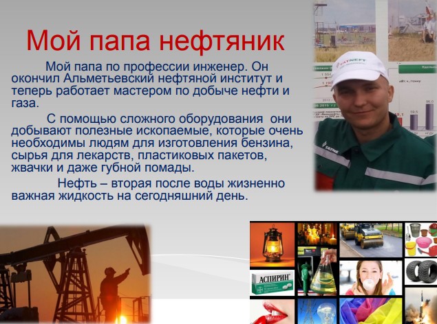 - Далее рассказывает о профессии отца, мой папа нефтяник