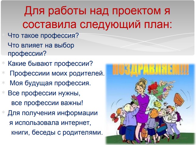По желанию в разрабатываемый план можно внести и другие пункты, например, кем работают родители, нравится ли им их работа, почему они выбрали именно ее. Что касается образца проекта, ученики оформляют его по своему усмотрению, предварительно составив последовательный план.