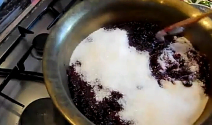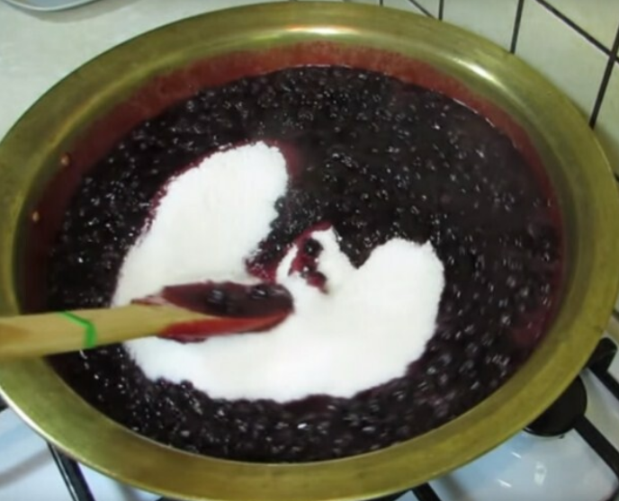 После того, как перекрутили, перекладываем в кастрюлю, насыпаем сахар и ставим на средний огонь. Помешивать постоянно.