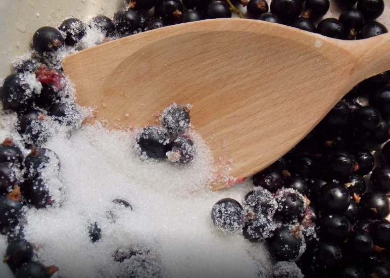 Использование деревянной толкушки — ягоды растолочь с сахаром, при этом не обязательно раздавливать все до одной ягоды. Пусть часть ягод останется целыми, это позволит лучше почувствовать вкус черной смородины.