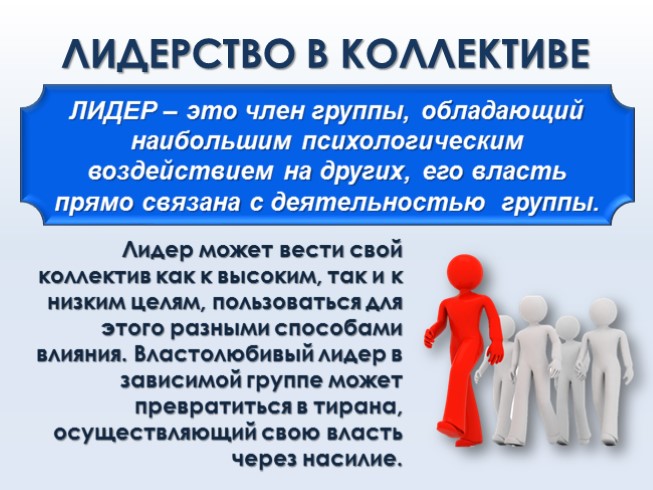 В любом коллективе есть лидер, он может быть формальным и неформальным. Формальный лидер — это руководитель, начальник, которого, назначают на этот пост. Лидер отличается способностью, брать на себя ответственность и интеллектом. Он четко понимает задачи, ставит их перед подчиненными и делает все возможное для достижения цели. Для него не важно, популярны его меры или нет, главное, результат, который будет получен, в случае, его успешного руководства. Умение оказывать влияние на людей силой своего авторитета, отличает неформального лидера. Он не занимает руководящие должности, но способен настроить персонал против администрации. Лидерские качества, обычно, даются человеку от природы, но их можно развить. Существуют предпосылки, которые делают человека лидером: