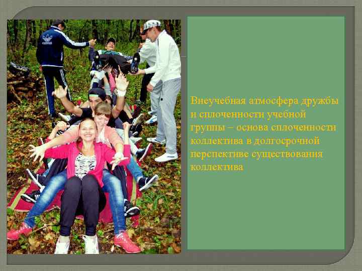 Приходя учиться на первый курс, каждый студент, сначала, относится с недоверием к каждому члену коллектива. Но, со временем, он адаптируется и формирует собственную точку зрения, привыкает к новому сообществу, несмотря на то, что это сообщество очень разноплановое и каждый индивидуум отличается собственными взглядами, имеет индивидуальный характер. В силу специфики, многие студенты, вынуждены жить в общежитии, где, тоже очень важна притирка друг к другу. Задача педагогов помочь студентам, обрести уверенность и понять собственную значимость.
