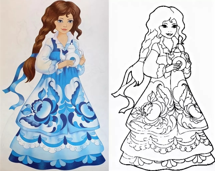 Среди народных промыслов большую часть занимают росписи, которые наносятся на поверхность предметов быта, игрушек, посуды, домов. Появились они в разное время и в разных регионах нашей страны. С помощью раскрасок ребенок учится понимать прекрасное, знакомится с различными видами искусства русских мастеров. Прежде чем приступить к работе, предлагаем объяснить ребенку, как называется техника, какими цветами следует воспользоваться для разукрашивания. Например, техника «Гжель» выполняется в синих цветах и его оттенках. Все шаблоны, представленные ниже, предлагаются для распечатки. Детям помладше подойдут варианты с оригиналом, где четко видно, какие краски лучше использовать.