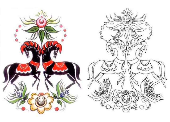 Технику Городецкой росписи придумали мастера, проживавшие на побережье реки Волги (сегодня Городец, это город, относящийся к Нижегородской области) в 19 веке. Ее применяли для украшения деревянных изделий, сначала это были прялки, которые изготовлялись для продажи, затем, дома и предметы быта. Каждый элемент росписи что-то означает, например, конь — богатство, цветы — успех в каком-то деле, а жар-птица символизирует счастье. Кисть для разукрашивания рисунка нужно держать перпендикулярно, сначала прорисовать крупные элементы, затем, переходить к мелким..