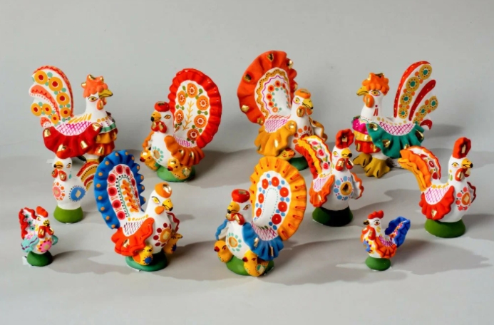 Дымковская роспись возникла несколько столетий назад, в Дымковской слободе города Вятки (сегодня г. Киров). В те времена технику придумали для росписи игрушек, умеющих издавать разные звуки — грохот, трещание или другой шум. Главное предназначение Дымковской игрушки — отгонять злых духов, которое в наши дни уже не актуально. Не смотря на это, народный промысел сегодня не забыт, а к традиционным изделиям добавились бравые кавалеры и модные барыни. В орнаменте используются круги, полоски, ромбы, зигзаги, полосы. Глядя на дымковскую игрушку можно сказать, что она достаточно проста и незамысловата, но роспись является символичной, ее отличает колорит, яркость, жизнерадостность, завершенность.