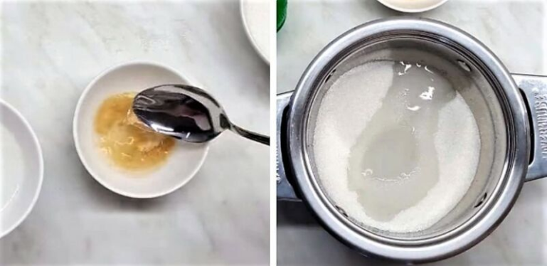 Для набухания желатин нужно замочить в воде (инструкцию смотрите на упаковке). Далее сварите сироп из сахара — залейте всю указанную порцию четырьмя ложками воды.