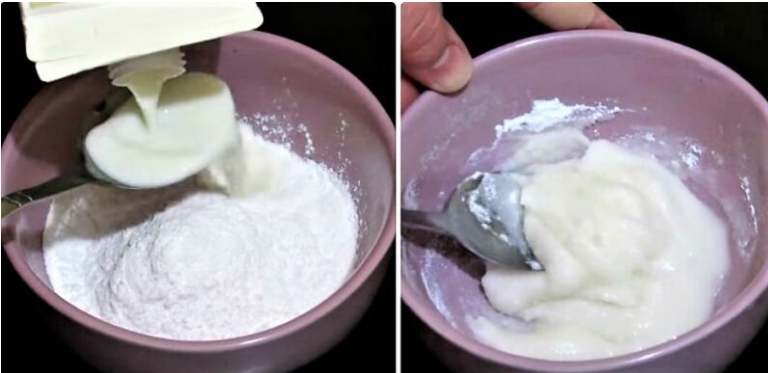 Добавьте к пудре молоко — 1 столовую ложку, перемешивайте пока не получится однородная консистенция..