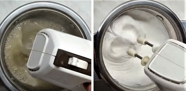 Миксером, на небольшой скорости взбейте, постепенно добавляйте обороты. Масса должна стать белоснежной и тягучей.
