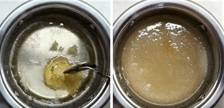 - Сахар залейте водой, в небольшой емкости поставьте на плиту, огонь должен быть небольшой, помешивайте пока масса не закипит.