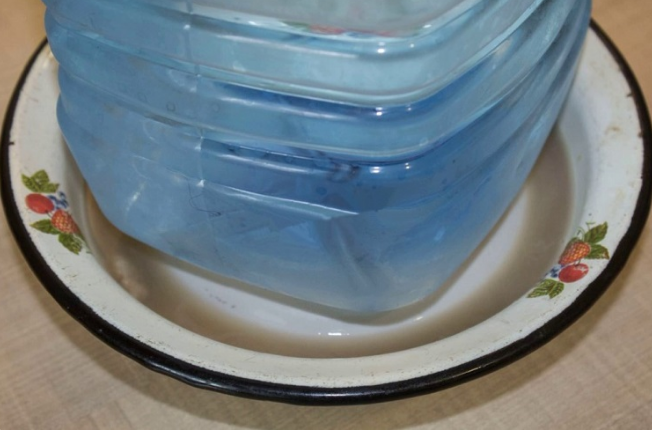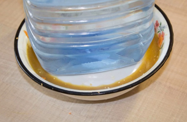 Сверху кладем плоскую тарелку и груз, в данном случае — 5-литровая бутылка, наполненная водой. Оставить на 30 минут.