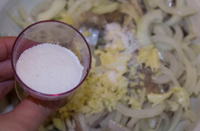Затем сахарный песок, масло растительное, соевый соус, красный молотый перец.