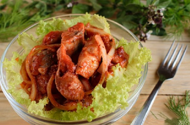 По прошествии времени раскладываем по тарелкам и наслаждаемся вкусной селедкой хе.