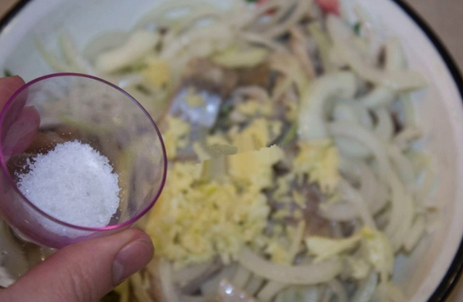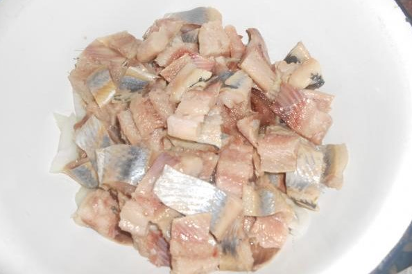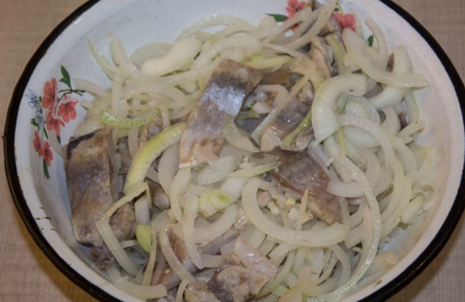 - Лук почистить и порезать полукольцами, можно мельче, добавить к селедке.
