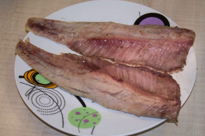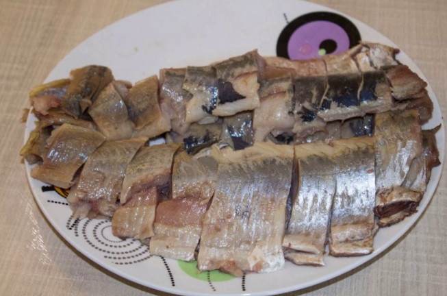 Селедку моем, чистим, удаляем кости и разрезаем на две половинки.