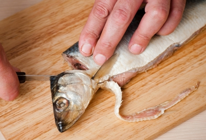 Чтобы кости лучше отделялись от мяса, неразделанную рыбу возьмите за хвост и ударьте несколько раз о стол.