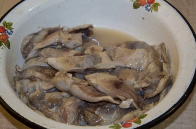 - С рыбы сливаем рассол и кладем в кастрюлю с крышкой.