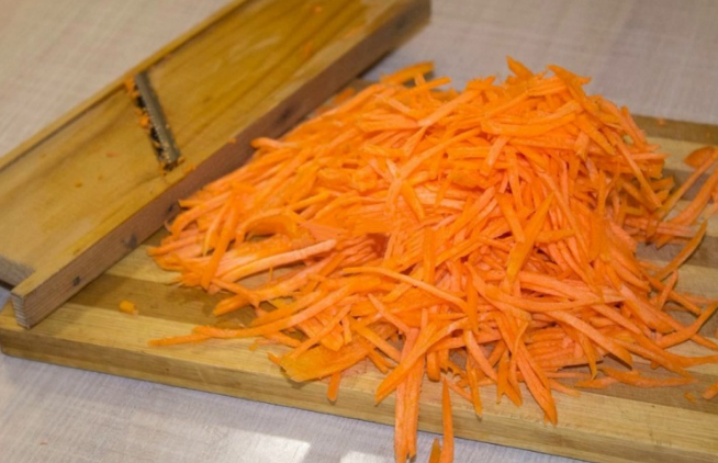 - Добавляем мелко нарезанный чеснок, затем морковь.
