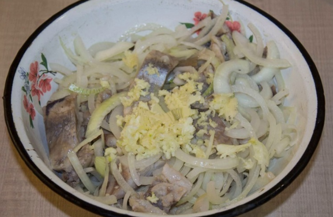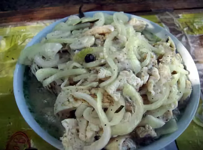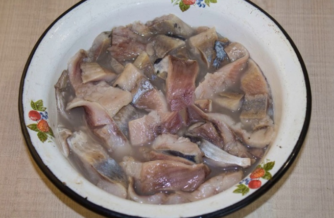 - Воду смешиваем с уксусом и заливаем селедку. Оставляем на один час.
