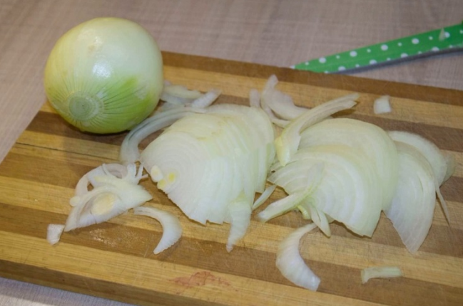 Пока селедка маринуется, готовим овощи. Лук режем полукольцами.