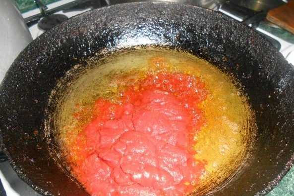 Подсолнечное масло разогреваем и добавляем пасту томатную.