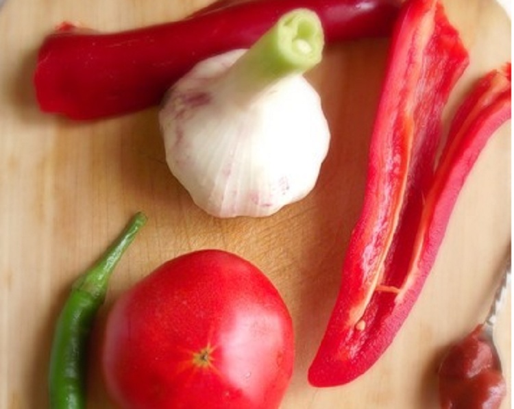Для этой рецептуры необходимо отдельную часть томатов освободить от кожицы. Нужно поместить их кипяток, в среднем на 5 минут. Вынуть шумовкой. Дать остыть и снять кожицу. Пропустить через мясорубку, прокрутить блендером или перемять вручную.