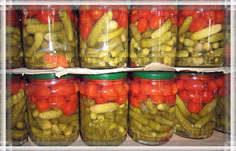 Закладываем в посуду, чередуя огурчики и помидорчики. Доверху наполняем горячей жидкостью. Сливаем ее спустя 10 минут в емкость. Соединяем с оставшимися составляющими, обязательно смесь нужно вскипятить. Сразу же заполнить посуду, закрутить.