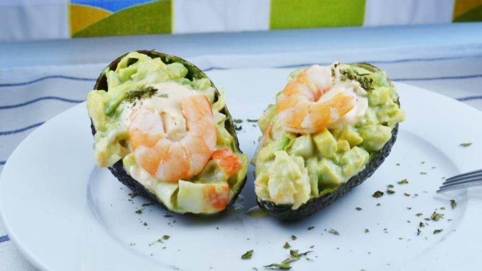 6. Салат выкладывают в «лодочки» из авокадо, украшают крупными креветками, посыпают зеленью.