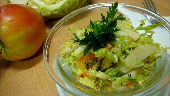 Вкусную закуску из капусты с яблоками быстрого приготовления можно предложить на любое торжество, только следует приготовить ее заранее.