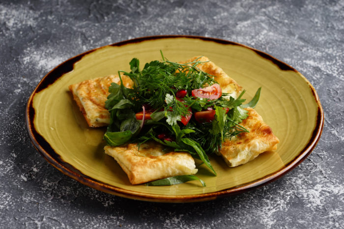 4. Из лаваша нарезают квадратики примерно 15×15 см, в центр, которых помещают по ложке начинки. Сворачивают конвертики и обжаривают с одной и другой стороны.