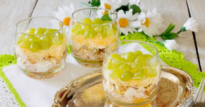3. Сверху трут сыр, опять смазывают, майонезом и выкладывают половинки виноградных ягод без косточек.