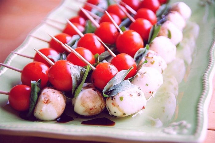 Закуска, которая подается в каждой итальянской семье — это кусочки моцареллы, листочки базилика и томаты черри. Подбирают одинаковые по размеру помидоры и кусочки сыра моцареллы, нанизывают на шпажки и выкладывают с базиликом, полив соевым соусом.