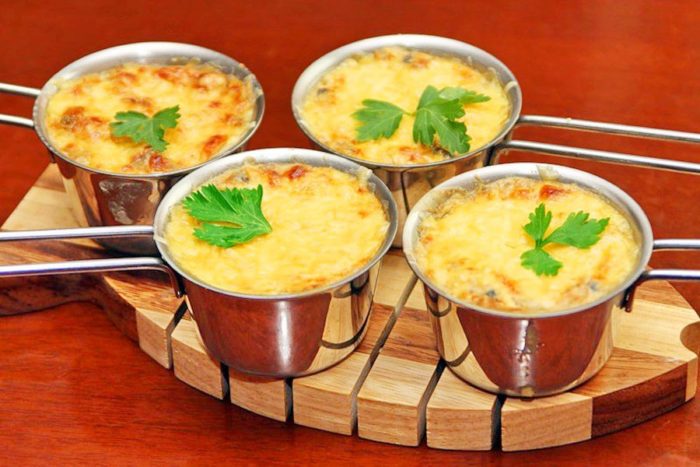 3. Грибную смесь помещают в специальные порционные формы для жюльена — кокотницы, заливают сливками или сметаной. Сверху — тертый сыр.