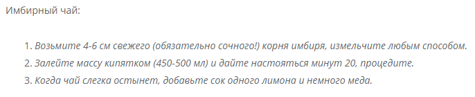 • Имбирный чай. Заварите в 200 мл кипятка 1 ч. л. молотого имбиря, мед и корицу по вкусу.