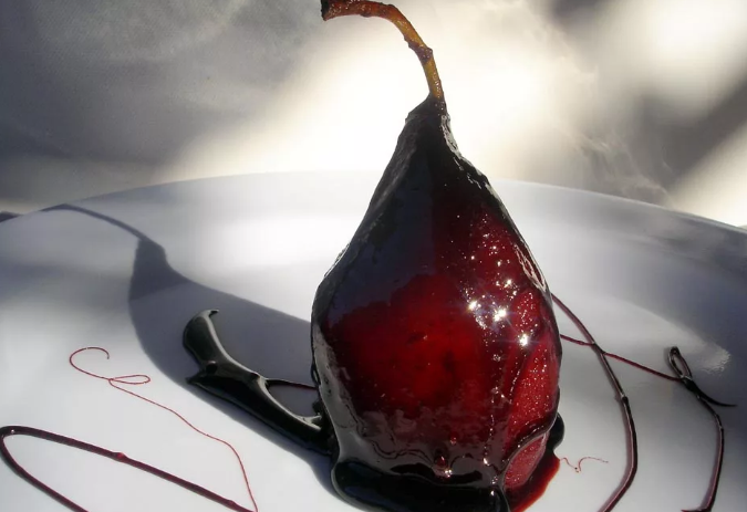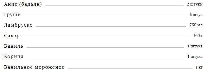 Снять с груши кожу. В кастрюлю налить Ламбруско ( шипучее полусладкое вино). Добавить семечки из стручка ванили, сахар, корицу, бадьян. После закипания положить грушу, убавить огонь до минимума и оставить на 1,5 ч., По истечении времени достать грушу и дать остыть. Вино в кастрюле уварить до загустения. У груши срезать донышко, поставить на тарелку и полить вином.