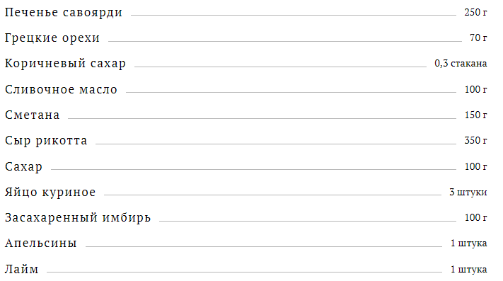 Раскрошить бисквитное печенье, грецкие орехи нарубить, добавить сахар (корич.), масло сливоч., перемешать и положить в форму (24 см в диаметре). Поставить в холодильник на 20 мин. Измельчить имбирь, смешать его со сметаной, белым сах. (100гр), яйцами, цедрой цитрусов. Основу покрыть имбирной смесью, запекать 30 мин. при t 180 гр.