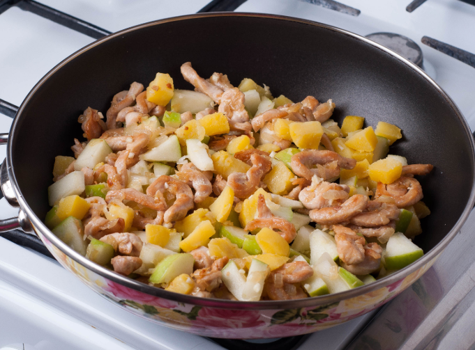 Перед тем, как подавать куриную смесь, прогреть ее хорошо в сковороде без добавления масла и положить на тарелку.