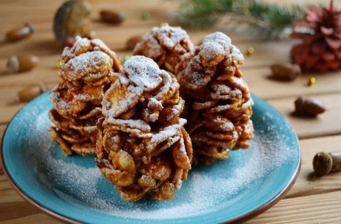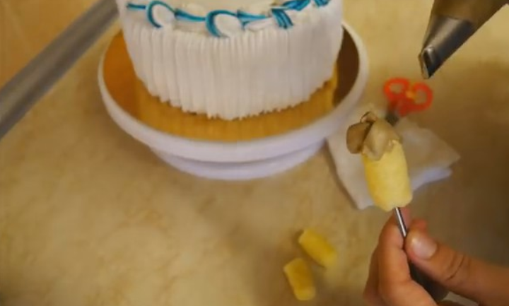 Гелевым красителем пририсуйте завитушки. На палочку наколите кукурузную палочку, делайте лепестки, чтобы получилась шишка.