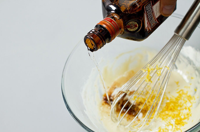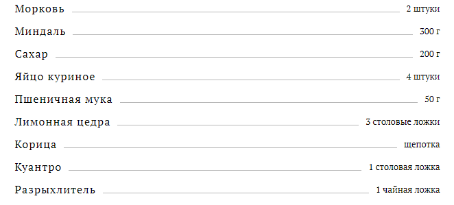 Разделить белки и желтки. С сахаром (100 гр) взбить желтки, добавить муки, корицу (щепотку), разрыхлитель, цедру, ликер. Все ингредиенты перемешать. Соединить массу с миндалем и морковью.
