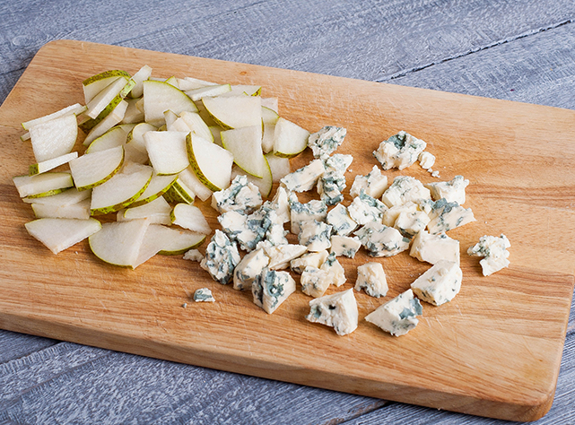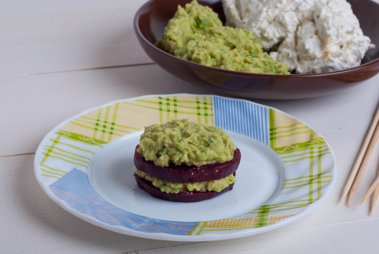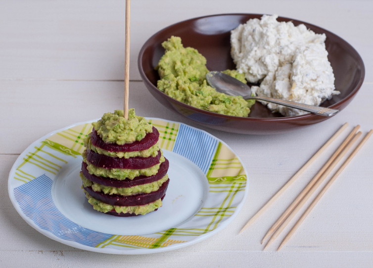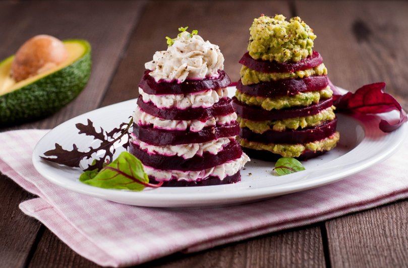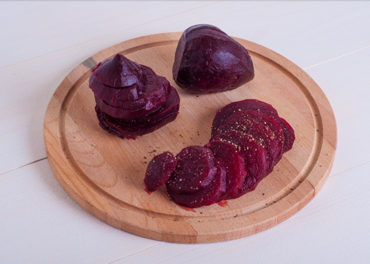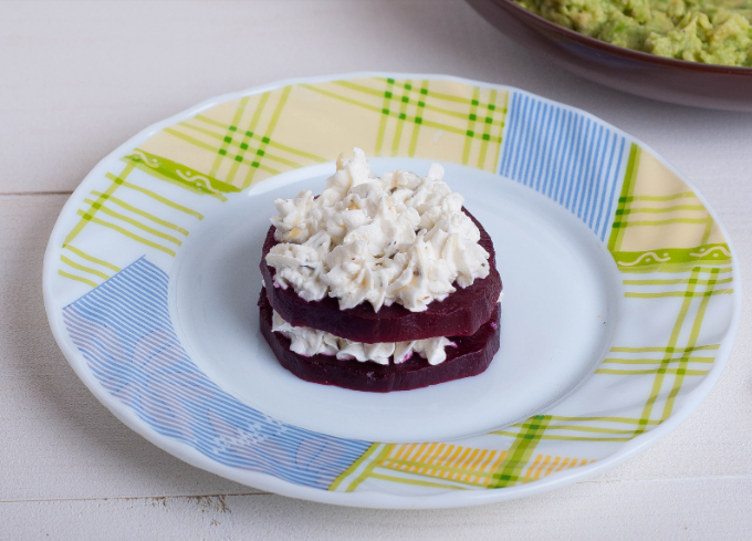 Свеклу отваривать, а лучше запекать в духовке, обернутую в фольгу. После очистки от кожуры, порезать на кружочки по 0,5 см. По вкусу перчить и солить.