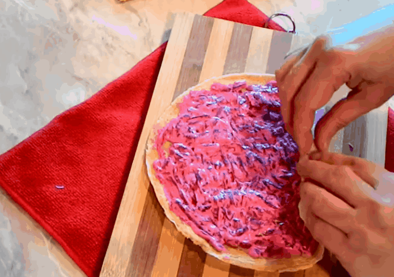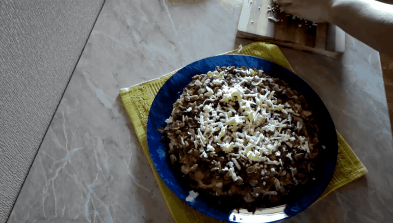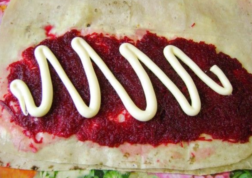 На самый широкий кружок свеклы выложить начинку. Далее, слоями.