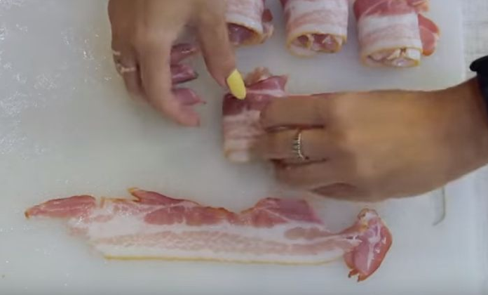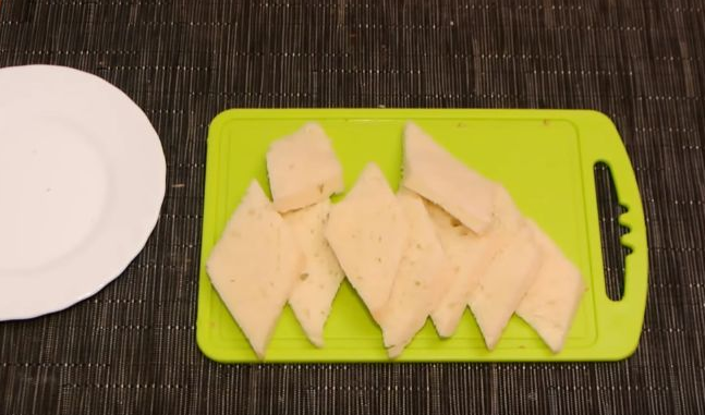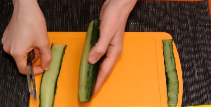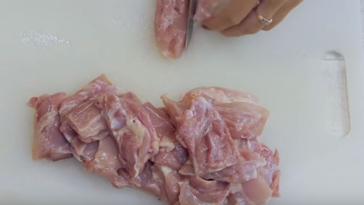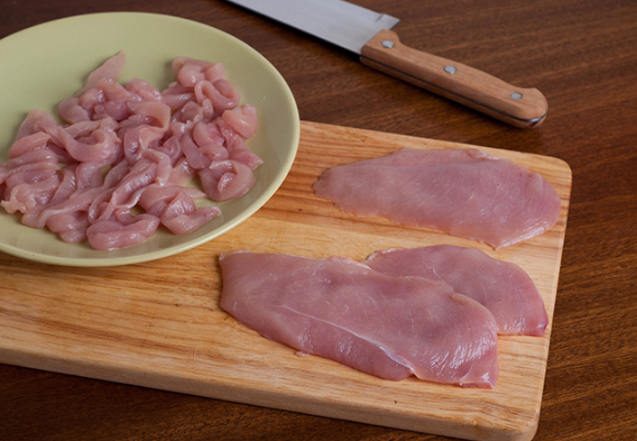 Порезать филе куриной грудки, сначала вдоль, затем — на полоски, солить не нужно.