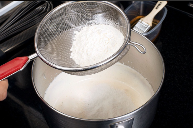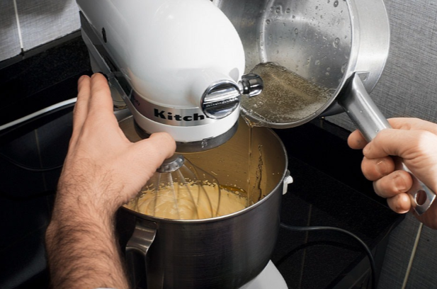 Желтки взбить. Разогреть сахар (оставшийся) с водой, влить в желтковую смесь и продолжать взбивать.