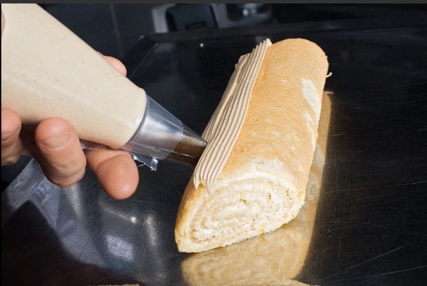 Помазать сиропом бисквит с нижней стороны. Распределить крем (тонким слоем). Свернуть рулет, обернуть пленкой и выдержать в холодильнике два дня.