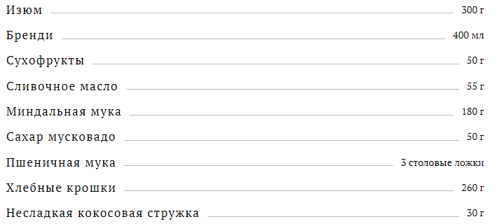 В бренди намочить изюм (на 1 час), обсушить. Духовку нагреть до 230 гр. Размельчить сухофрукты, добавить 50 гр. масла, сахаром, мукой, стружкой кокосовой, орехом мускатным, тертой морковью. Смешать — яйца, патоку, пиво, соки, бренди, смесь фруктовую, изюм. Перемешать. Заполнить тестом две формы (глубокие), накрыть фольгой, края закрепить. Налить кипяток в противень (глубокий) и поставить на него формы с тестом, чтобы вода доходила до половины и накрыть. Выпекать 4 ч., до готовности, подливать воду по необходимости.