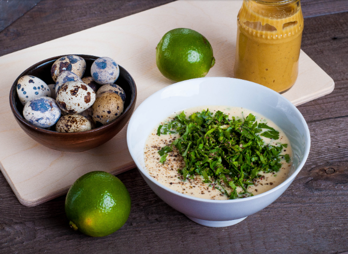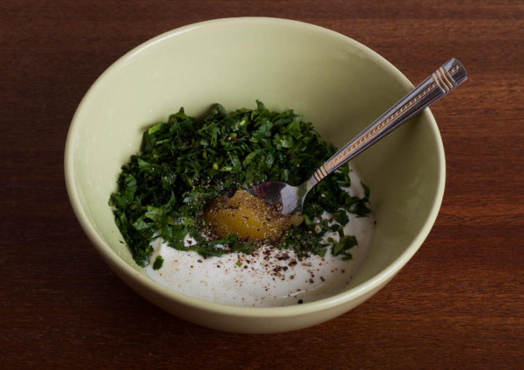 Соус — перемешать лимонный сок, йогурт, зелень (рубленную), перец молотый и мед.