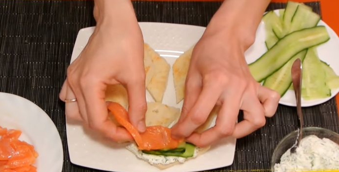 Полоски филе выкладывать в разогретое масло таким образом, чтобы получились разные формы. Обжаривать до золотистого цвета с каждой стороны. Выложить на бумажные салфетки, чтобы убрать лишний жир, немного присолить.