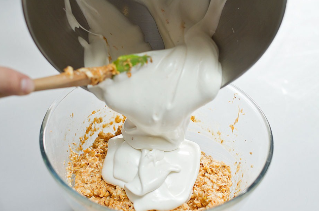 Взбить белки с сахаром (100 гр.) до плотной пены и добавить в тесто.